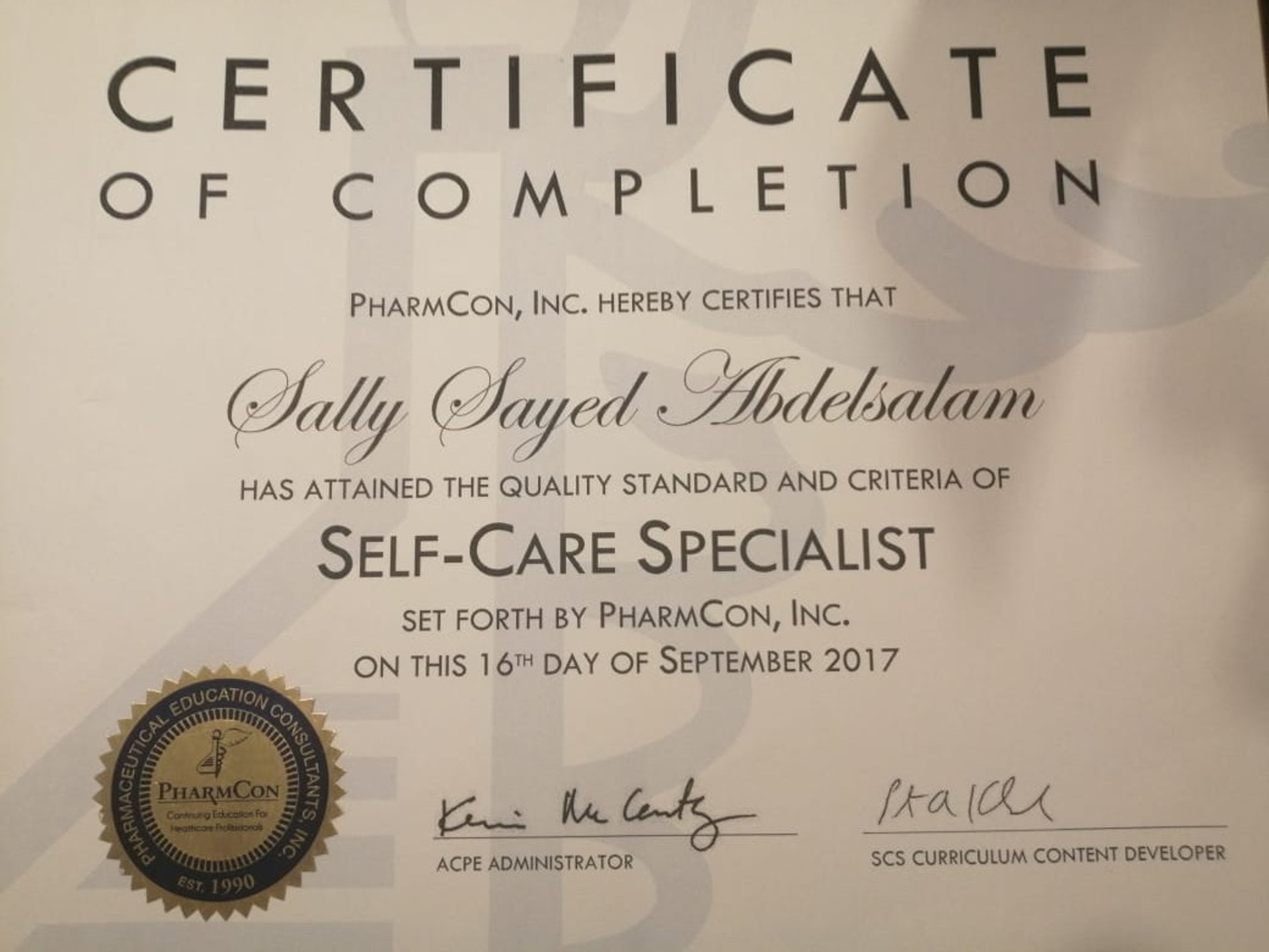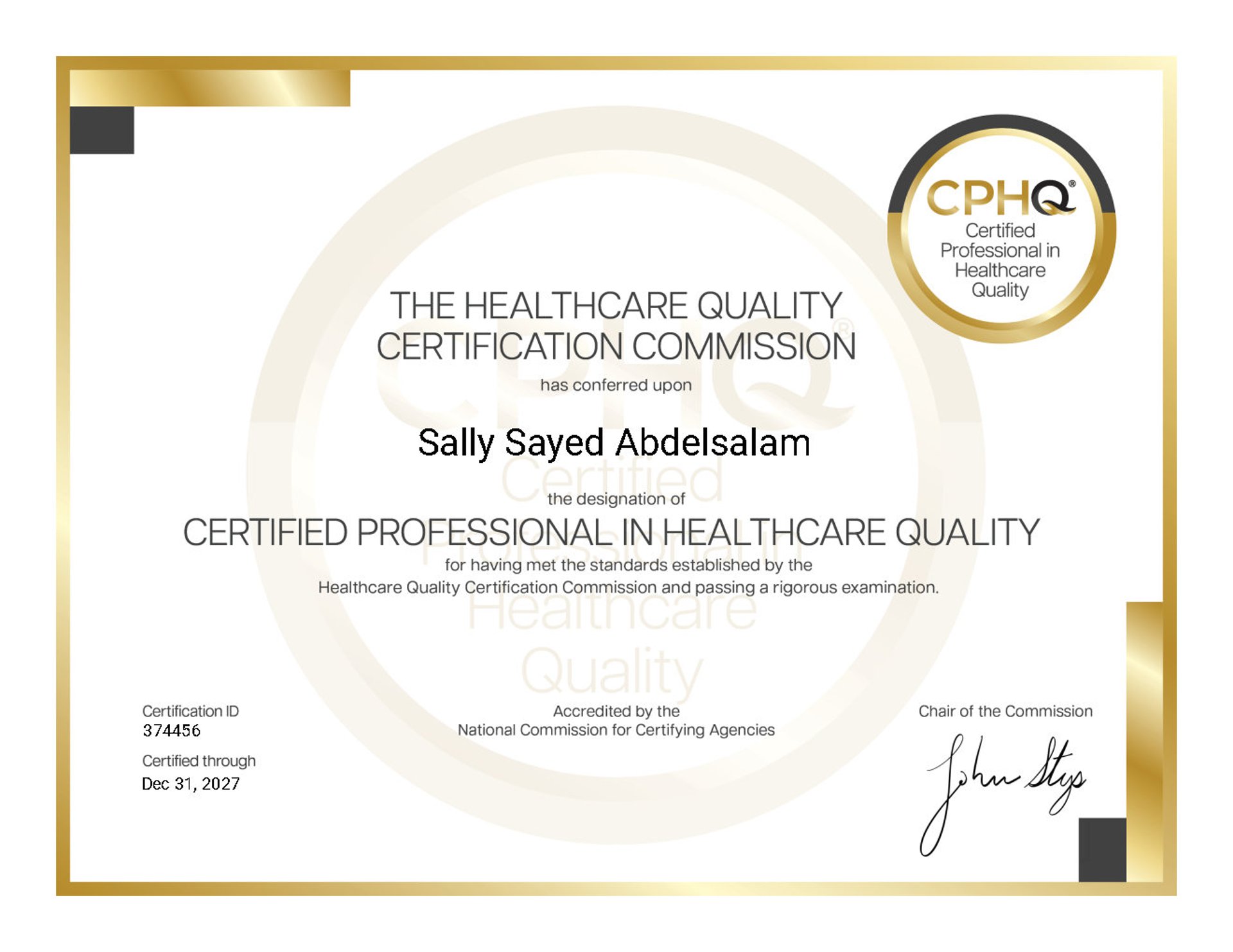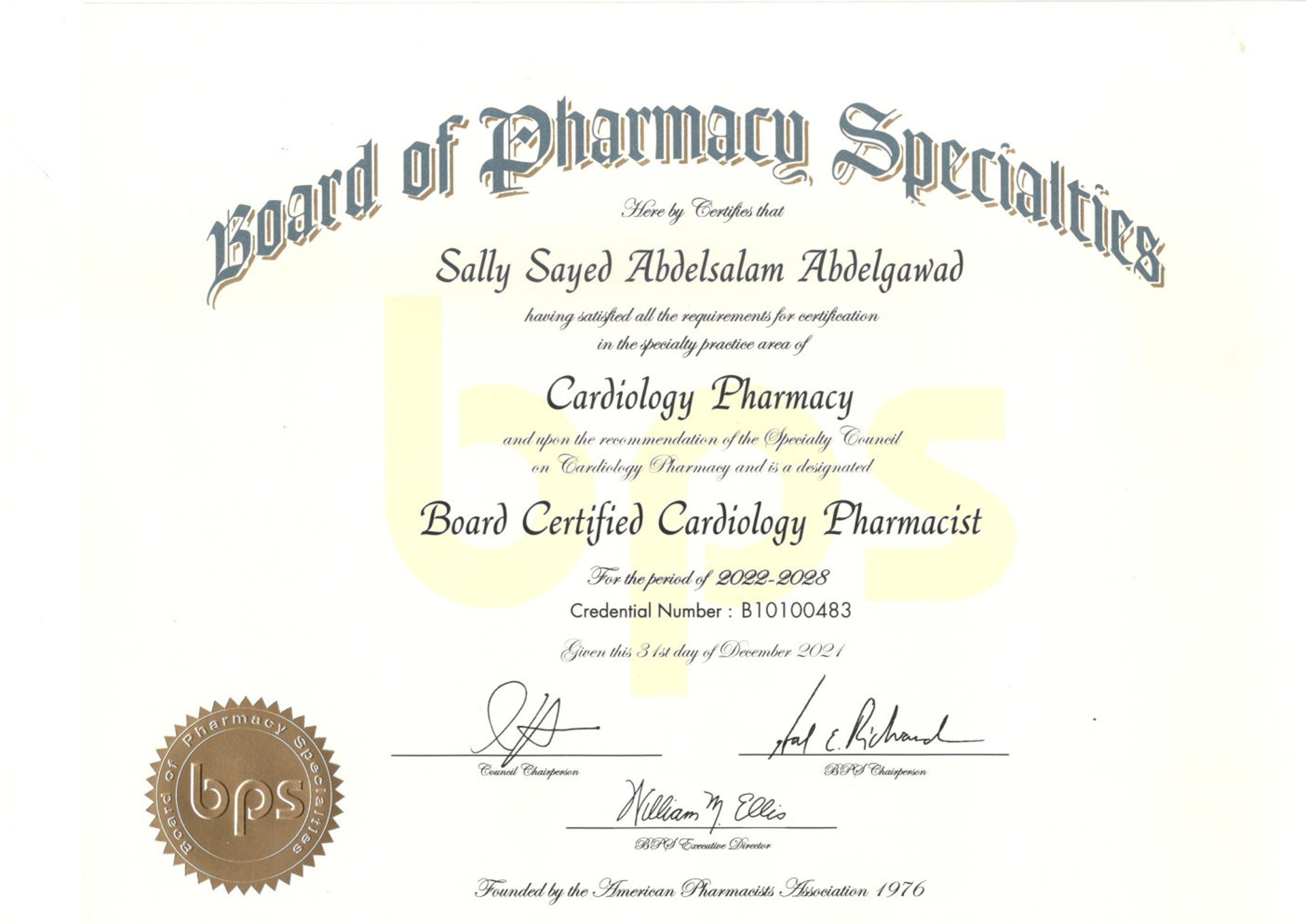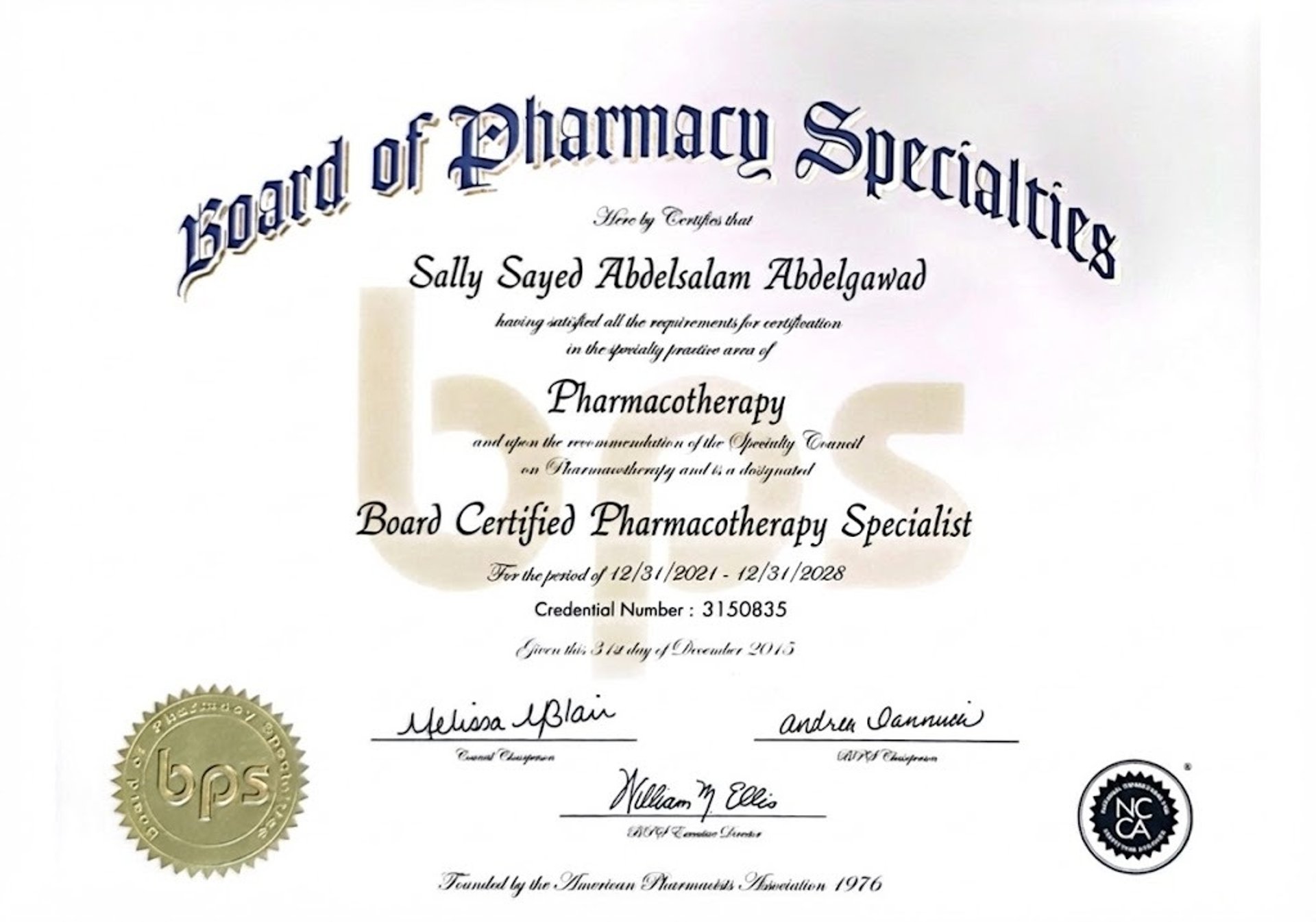 A certificate of appreciation presented by the Arab Contractors Medical Center in recognition of Dr. Sally Sayed’s outstanding effort and excellence in delivering the Pharmacotherapy BPS Prep Course between October 2020 and December 2021.