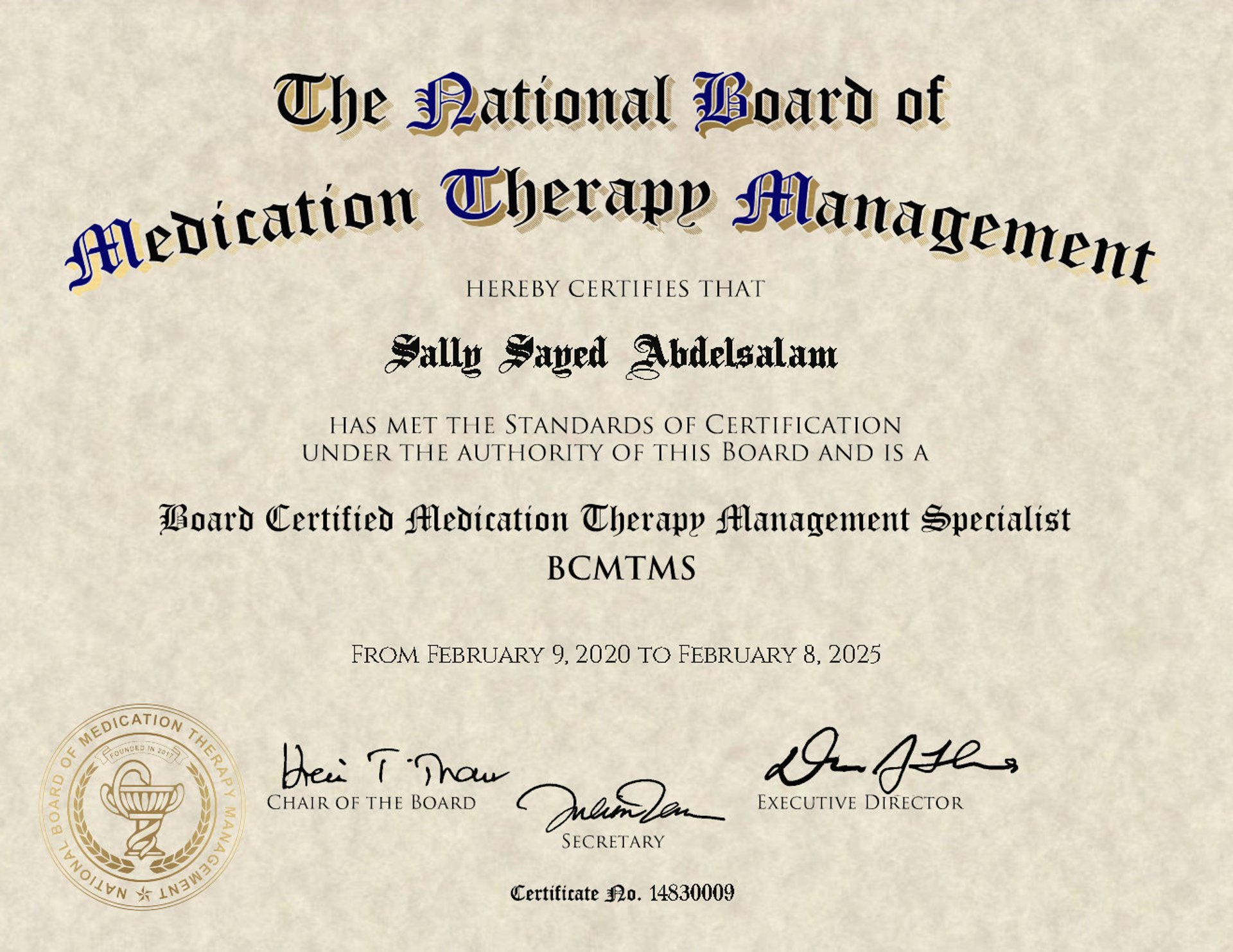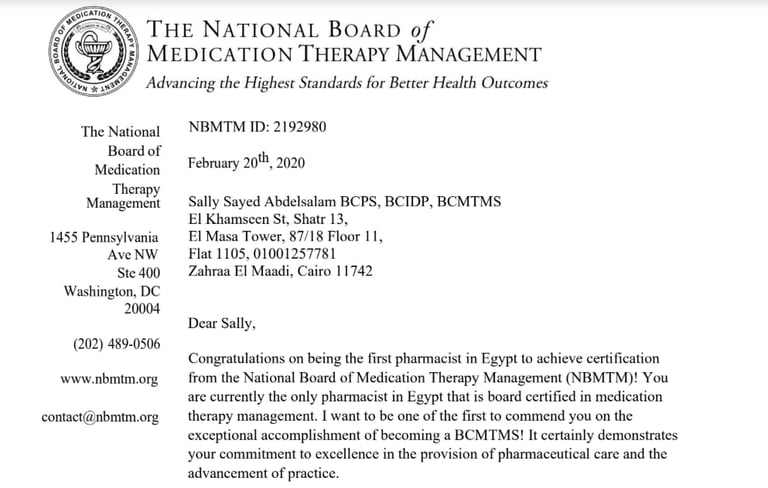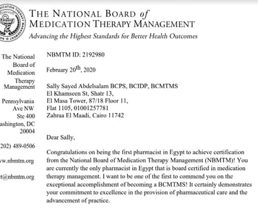 An official recognition letter from the National Board of Medication Therapy Management (NBMTM), USA, honoring Dr. Sally Sayed as the first pharmacist in Egypt to achieve the Board Certified Medication Therapy Management Specialist (BCMTMS) credential.