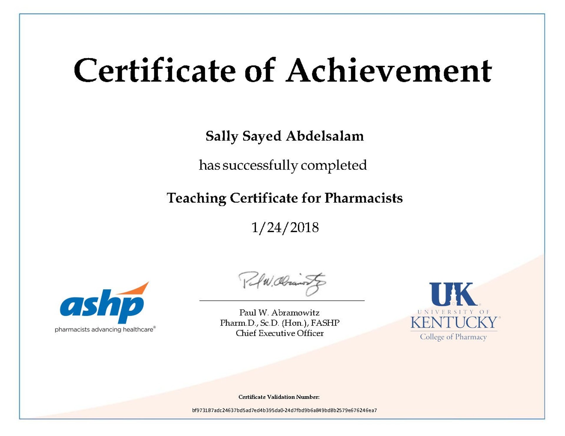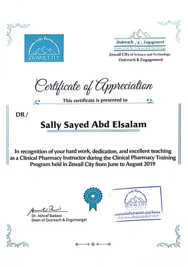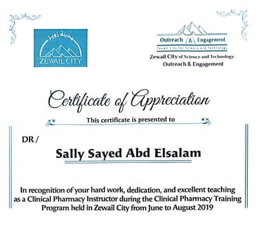 A certificate of appreciation awarded to Dr. Sally Sayed by Zewail City of Science and Technology – Outreach & Engagement in recognition of her hard work, dedication, and excellent teaching as a Clinical Pharmacy Instructor during the Clinical Pharmacy Training Program held from June to August 2019.
