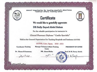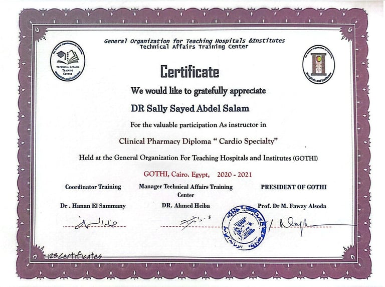 A certificate of appreciation awarded by the General Organization for Teaching Hospitals and Institutes (GOTHI) in recognition of Dr. Sally Sayed’s valuable contribution as an instructor in the Clinical Pharmacy Diploma – Cardio Specialty during the 2020–2021 academic year.