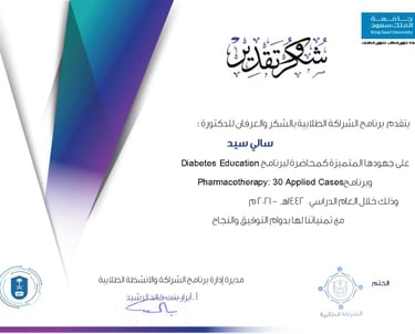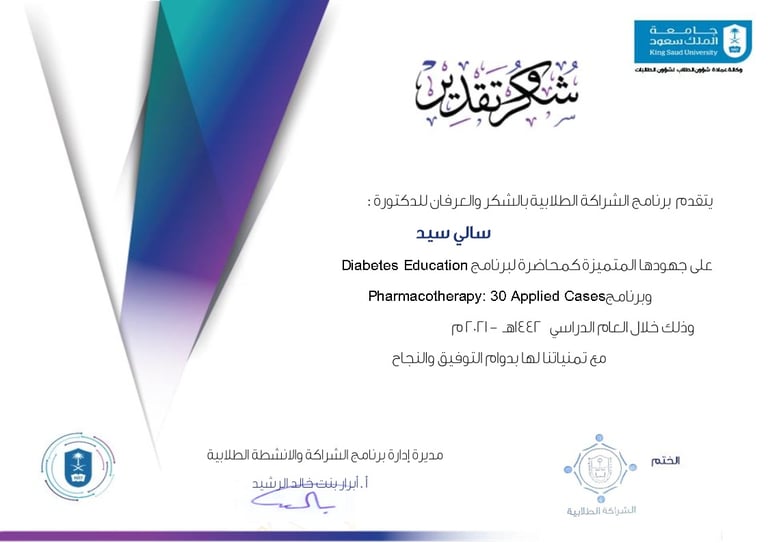 A certificate of appreciation awarded by King Saud University in recognition of Dr. Sally Sayed’s outstanding contribution as a lecturer in the Diabetes Education Program and the Pharmacotherapy: 30 Applied Cases Program during the academic year 1442–2021.