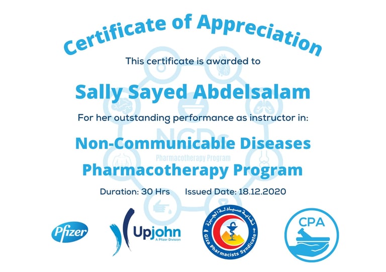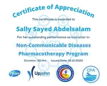 A certificate of appreciation awarded to Dr. Sally Sayed for her outstanding performance as an instructor in the Non-Communicable Diseases Pharmacotherapy Program, delivered in collaboration with Pfizer / Upjohn, the Giza Pharmacists Syndicate, and CPA.