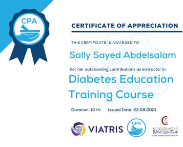 A certificate of appreciation awarded to Dr. Sally Sayed for her outstanding contributions as an instructor in the Diabetes Education Training Course, delivered in collaboration with Viatris, CPA, and the Cairo Pharmacists Syndicate.