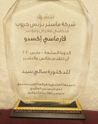 Award presented by Master Business Group during the 7th Pharmacy Expo (March 2020) in recognition of Dr. Sally Sayed’s outstanding scientific contribution and exceptional professional excellence at a national and international level. This honor reflects her continued commitment to advancing pharmacy education and empowering healthcare practitioners.